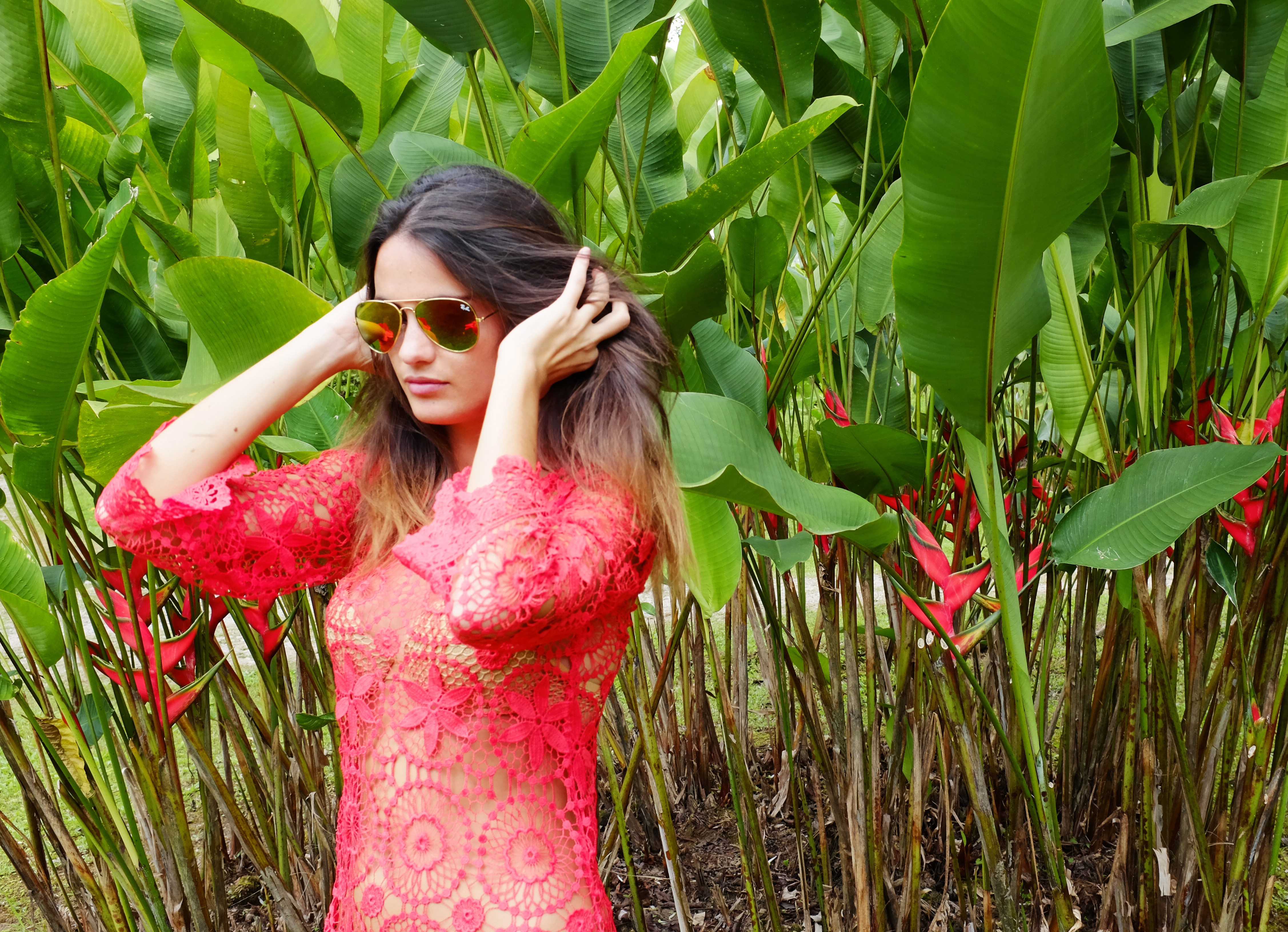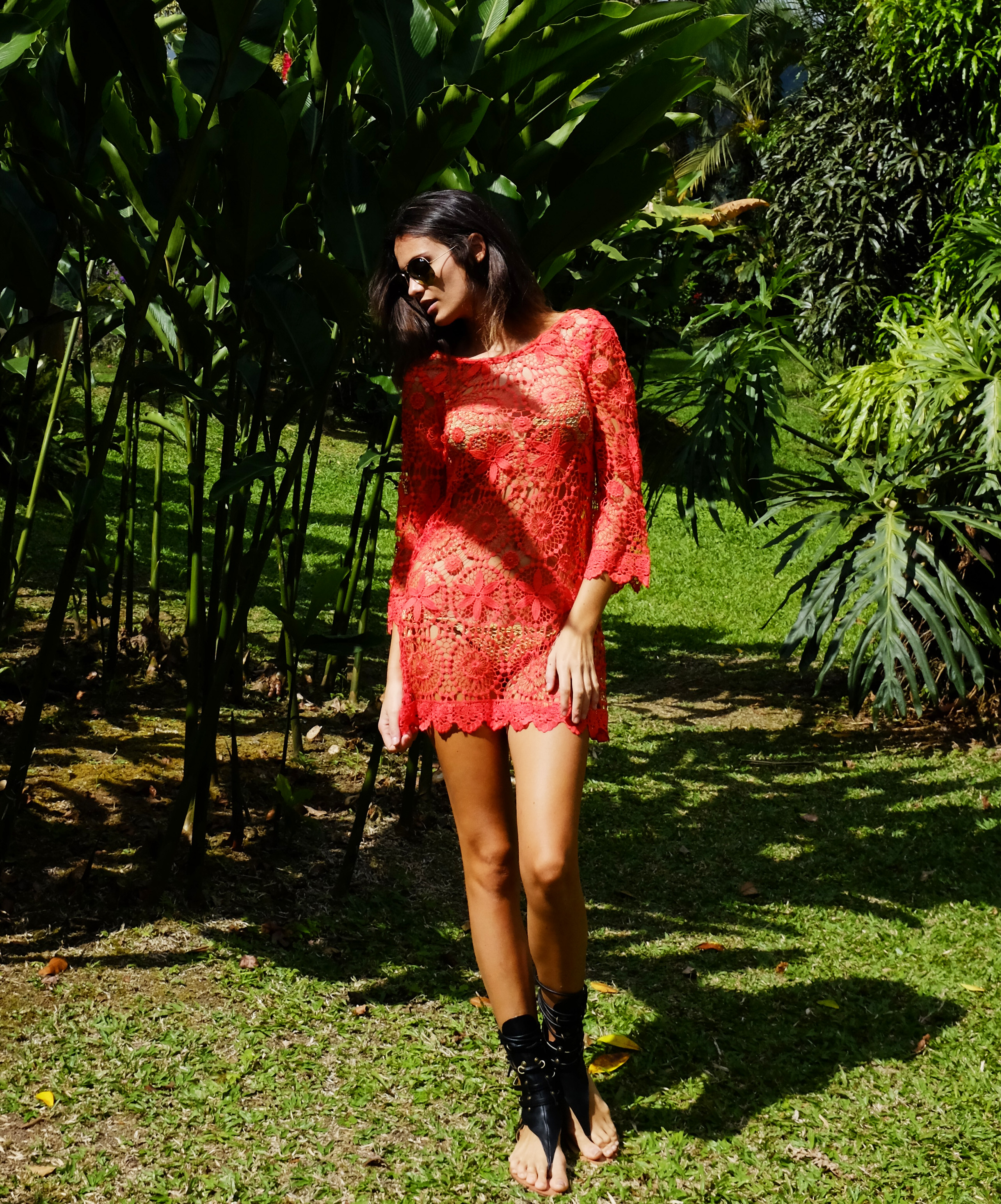 Red Crochet dress – H&M Coachella range; Sunglasses – Ray Ban Aviator; Gladiator sandals – Miami souvenir; Dark grey cotton shirt – H&M; Sunglasses – Ray Ban Wayfarer; Camera top – London (Camden market) souvenir; Boyfriend jeans – Abercrombie & Fitch; Shoes – Converse; Cut-out floral one-piece – Miss Sixty; Beige bikini – Yamamay; Multi-colour sports bikini – Oakley; Silver-frame sunglasses – Moni & Coli Puerto Rico; Brown and white wooden bangles – H&M; Artisan flower backpack – Costa Rica souvenir;  Crop top – Clover Canyon; Orange beaded wrist-band – Costa Rica souvenir; Denim shorts – Mango.