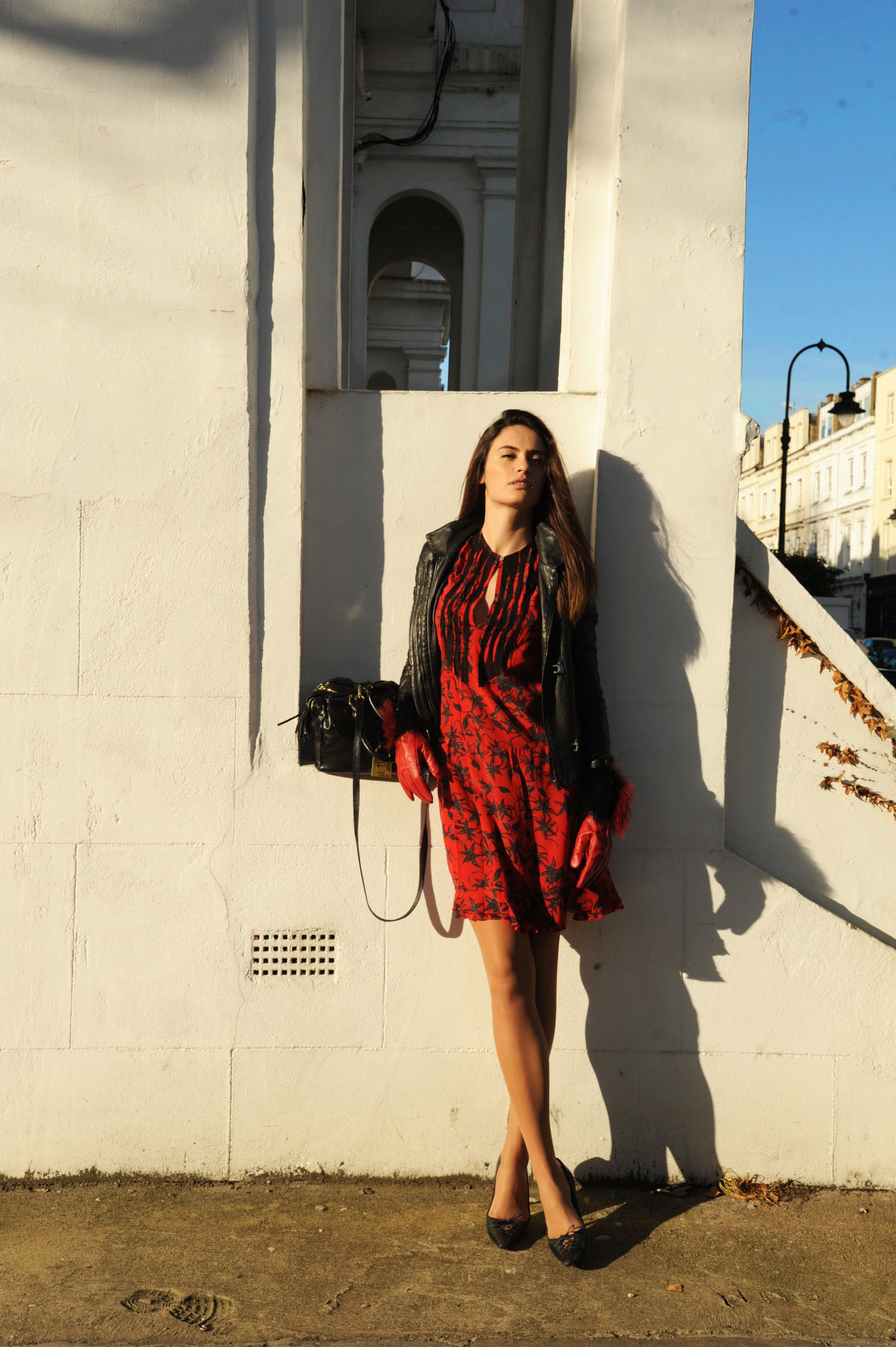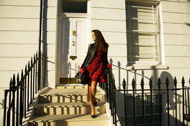 Dress – Zadig & Voltaire; Jacket – custom made in Italy; Bag – Custom made in Italy; Shoes – Jimmy Choo; Gloves – Roberto Cavalli.